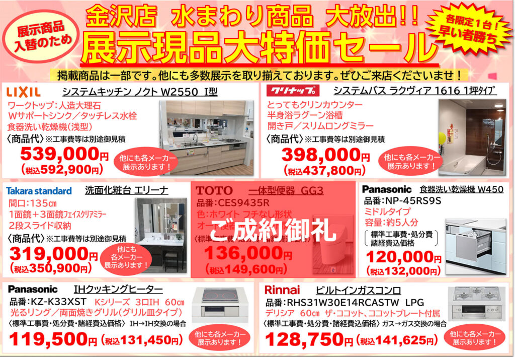 キッチン、バスなどの水廻り商品から物置まで取り揃えております。各1点限りのため、『アークホーム金沢店』へお早めに ご相談ください。ぜひ、ご来店いただき、現物をご覧くださいませ!