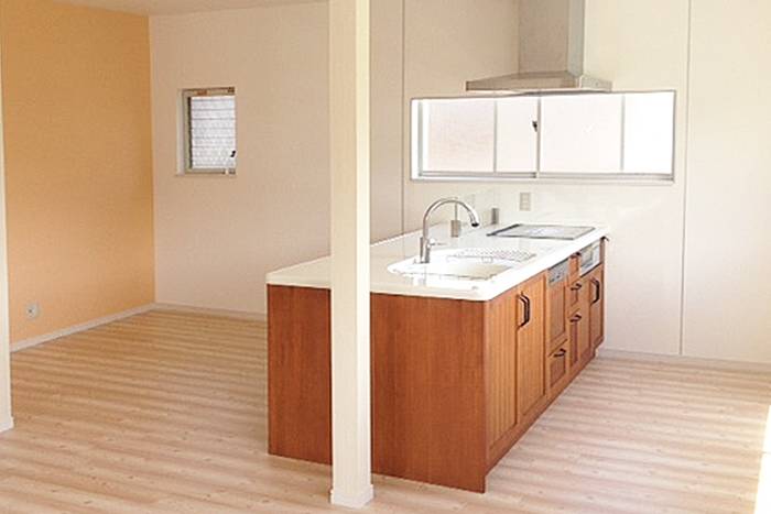 柱にもクロスを巻き、木目のシステムキッチンを際立たせました。