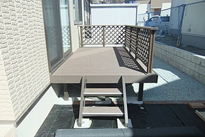 L字型にフェンスで囲い、ステップを取り付けて庭へ降りれるようにしました。