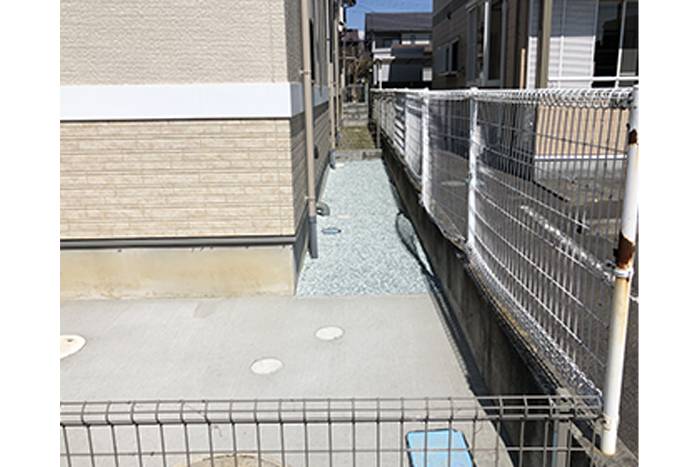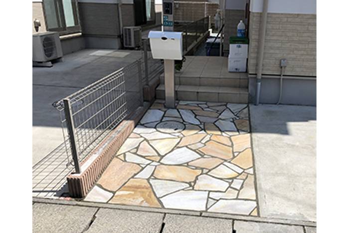 アプローチは天然石乱形貼り、庭は土間コンクリートとし、メンテナンスしやすくすっきりしたお庭になりました。