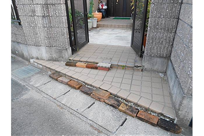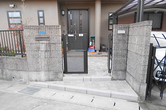 建物・門袖ブロックの雰囲気に合った落ち着いた色合いのインターロッキングを施工しました。