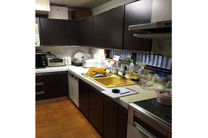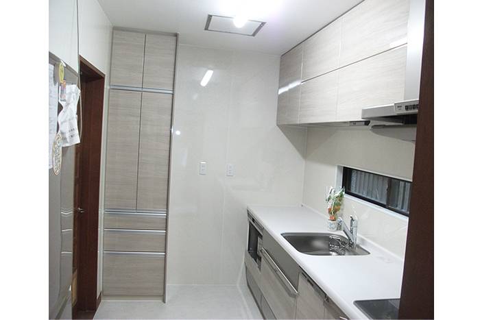 キッチンの壁全面をキッチンパネル貼りして手入れがしやすくなりました。