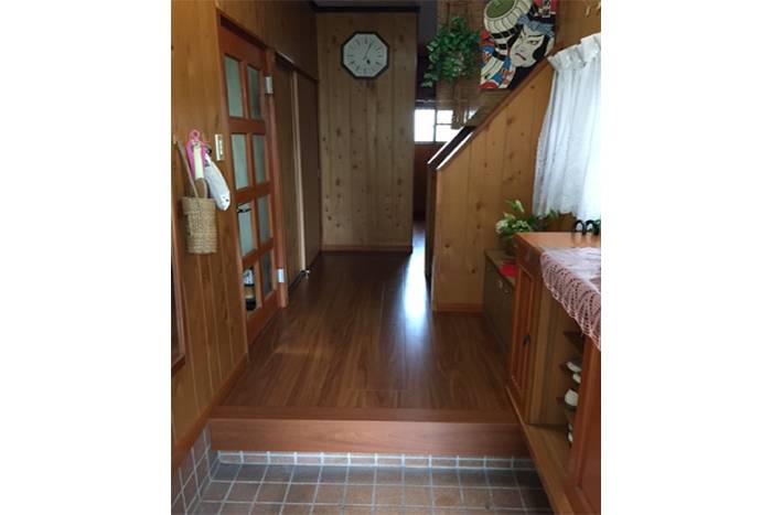 玄関ホール改装工事 床張り替え(クッションフロア・フローリング) 内装 2016.9.27 ◆After【フローリング上張り】東洋テックス:ダイヤモンドフロア◆Before【フローリング上張り】施工前 ポイント 床のタルミ解消の為、フローリングを上張しました。 使用した商品 ◆床材 東洋テックス:ダイヤモンドフロア 概算施工金額 ¥93,000 事例No.3505-99-558-012