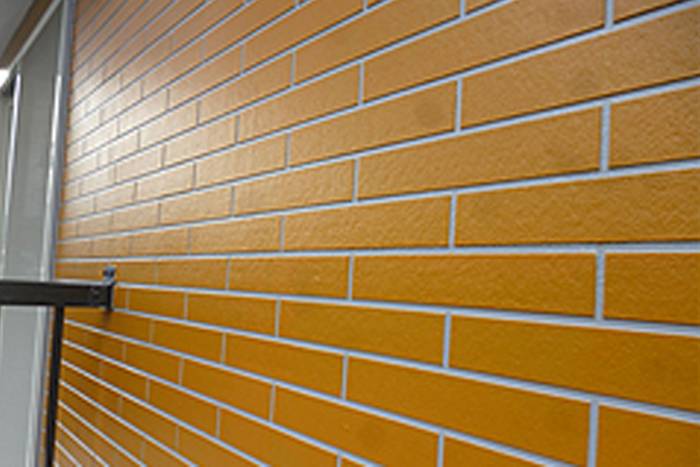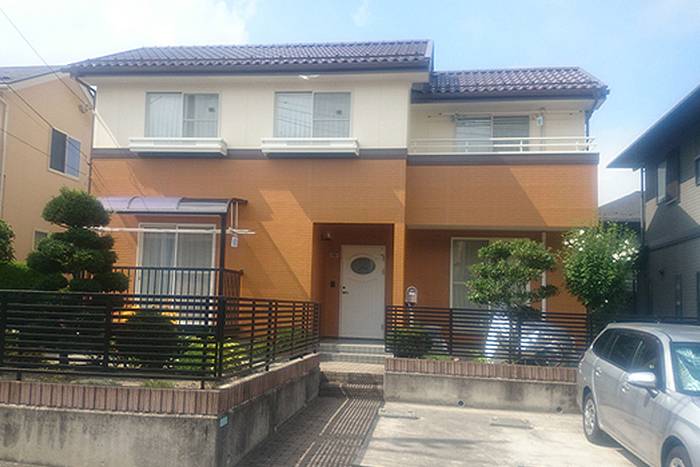 1階外壁は目地をグレー+タイル部をオレンジ色にて目地を残し塗装。