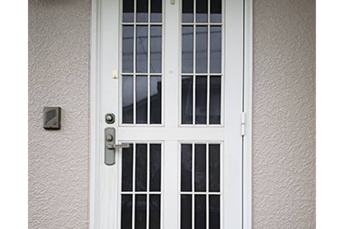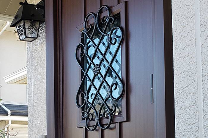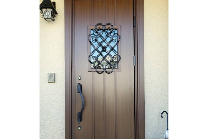 門燈や鉢と格子、傘立てと扉カラーのコーディネートを重視。