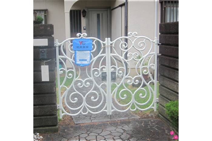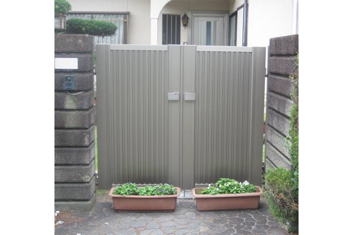 アルミ鋳物門扉から玄関ドアとの色調も合う目隠しタイプの門扉へ取替えしました。