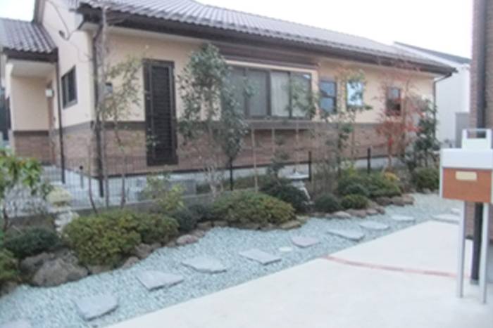 既存土間コンクリートを一部解体し、自然石を敷設し、門塀には同じく自然石素材の化粧ブロックを組積しました。