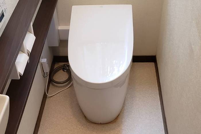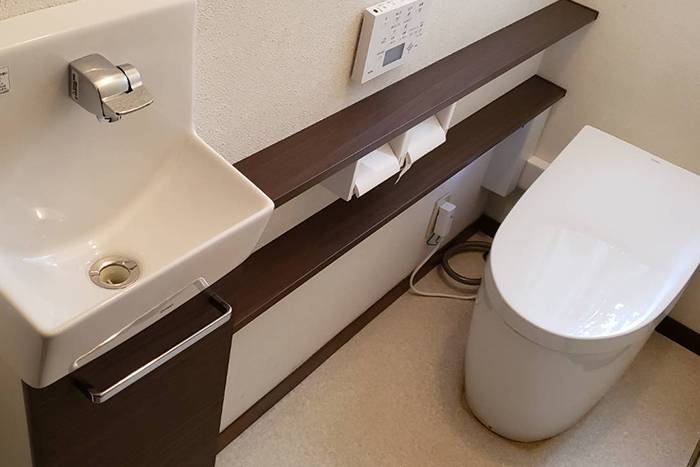 タンクレスのため手洗い器付のワンデーリモデルタイプを設置させて頂きました。