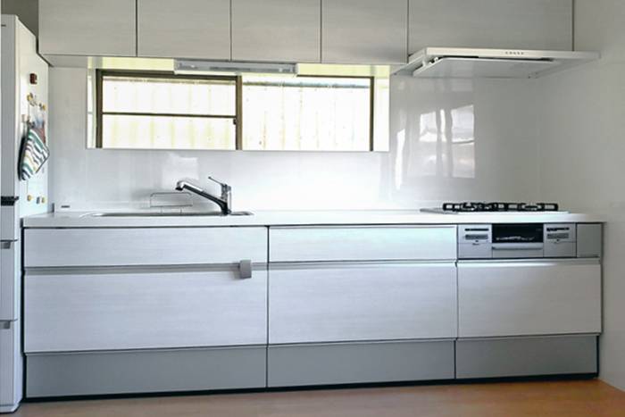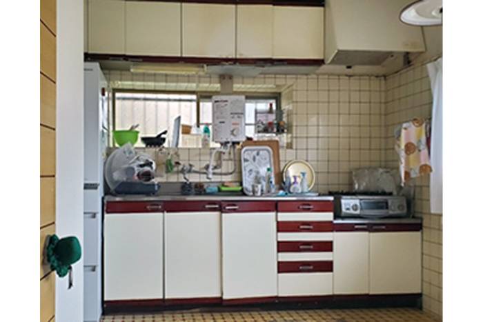 築28年のDK改築工事で床はCF張りからクリエベール色のフローリング張り、キッチンもシステムキッチンのクリエアイボリー色で柔らかな色合いで明るくやさしいDKを演出しました。